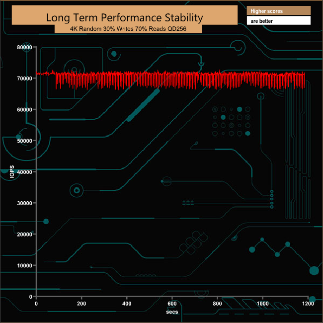 For the long term performance stability test, we set the drive up to run a 20-minute 4K random test with a 30% write, 70% read split, at a Queue Depth of 256 over the entire disk. The IronWolf 110 240GB drive averaged 70,841.22 IOPS for the test with a superb, enterprise-grade performance stability of 97%.