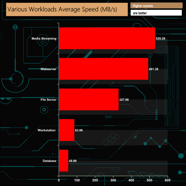 The 240GB IronWolf 110 showed strong performance across all of the workloads we tested on it, particularly the 529MB/s Media Streaming figure and the 50MB/s performance for the Database workload.