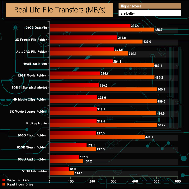 The only time the transfer rate dropped beneath the 100MB/s level in our real life file transfer tests was when the drive transferred the small bity files in the 50GB File Folder.