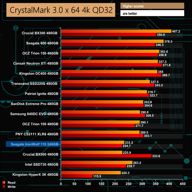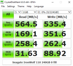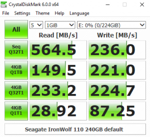 The IronWolf 110 doesn't handle the CrystalDiskMark benchmark tests, at a deep queue depth of 32, too well. Looking at the two benchmark result screens, it appears that the Seagate controller has a preference for compressible data particularly when it comes to writes.