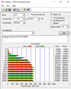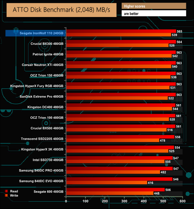 The 240GB version of the IronWolf 110 is rated as up to 560MB/s for Sequential reads and up to 345MB/s for writes. Using the ATTO benchmark we could confirm those figures with a read result of 565MB/s. That official write figure seems to be on the conservative side as our ATTO write result was 539MB/s. The read figure of 565MB/s is just enough to sit the IronWolf 110 on top of our results chart.