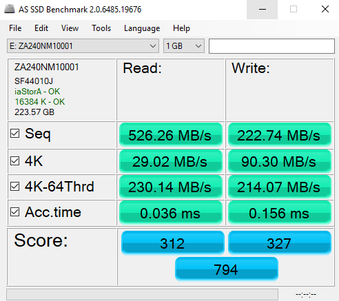 AS SSD is a great free tool designed just for benching Solid State Drives. It performs an array of sequential read and write tests, as well as random read and write tests with sequential access times over a portion of the drive. AS SSD includes a sub suite of benchmarks with various file pattern algorithms but this is difficult in trying to judge accurate performance figures.