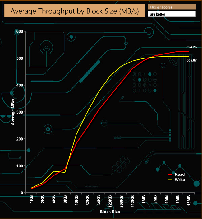 The peak average read speed of 524.31MB/s came at the 8MB block size while peak writes occurred at the 4MB block size at 506.54MB/s.