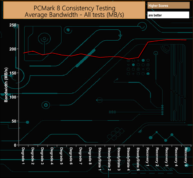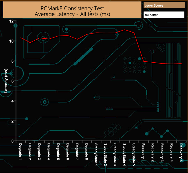 Futuremark’s PCMark 8 is a very good all round system benchmark but it’s Storage Consistency Test takes it to whole new level when testing SSD drives. It runs through four phases; Preconditioning, Degradation, Steady State, Recovery and finally Clean Up. During the Degradation, Steady State and Recovery phases it runs performance tests using the 10 software programs that form the backbone of PCMark 8; Adobe After Effects, Illustrator, InDesign, Photoshop Heavy and Photoshop Light, Microsoft Excel, PowerPoint, Word, Battlefield 3 and World of Warcraft. With some 18 phases of testing, this test can take many hours to run.
