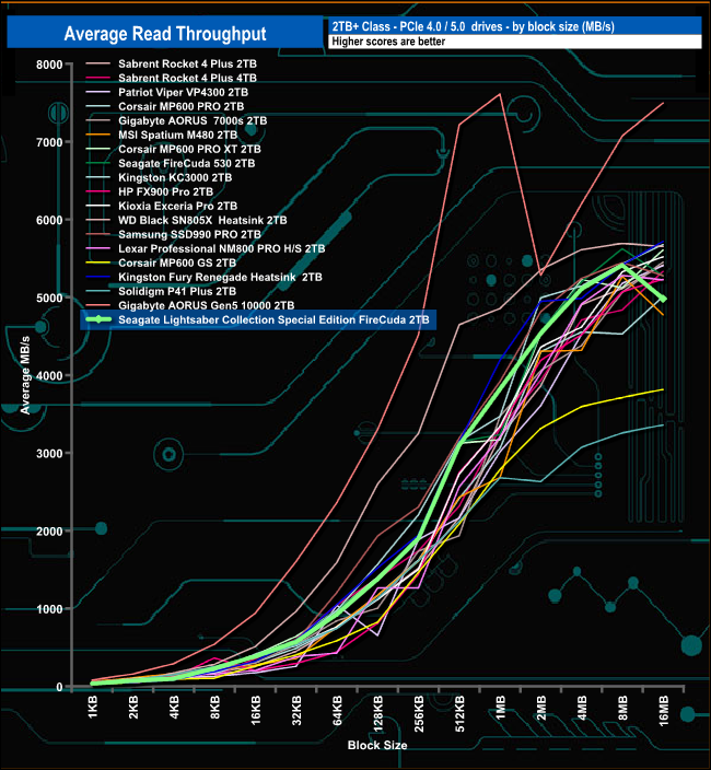 In our throughput test, the Lightsaber Collection Special Edition FireCuda which uses a FireCuda 530 is very oddly 212MB/s slower than the original FireCuda 530. It might be that the later firmware the Special Edition drive uses is having some effect on this test.