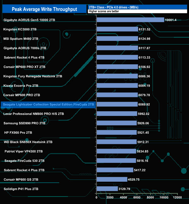 In complete contrast to the read performance, the write throughput test sees the Lightsaber Collection Special Edition FireCuda produce a test result that is 253MB/s faster than the standard FireCuda 530.