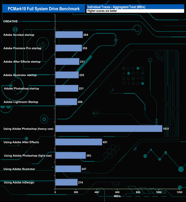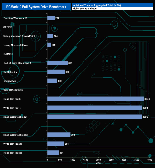The PCMark 10 Full System Drive Benchmark uses a wide-ranging set of real-world traces from popular applications and common tasks to fully test the performance of the fastest modern drives. The benchmark is designed to measure the performance of fast system drives using the SATA bus at the low end and devices connected via PCI Express at the high end.