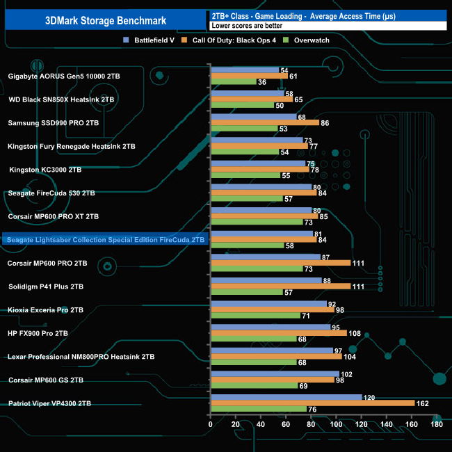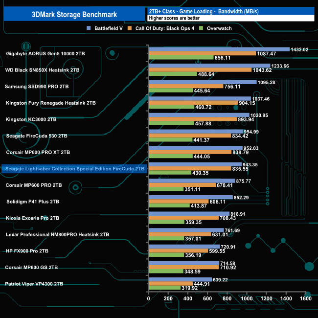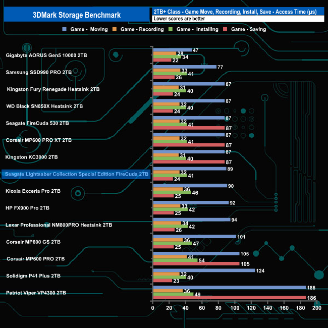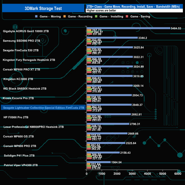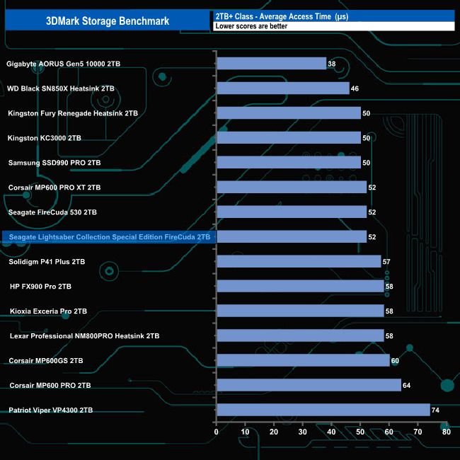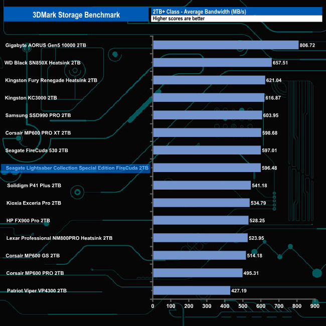 In 3DMark’s Storage Test, the 2TB Lightsaber Collection Special Edition FireCuda sits in a mid-table position in our results chart, just behind the standard version of the FireCuda 530.