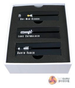 Above you can see the three different heatsinks, with their LED lightsabers turned on.