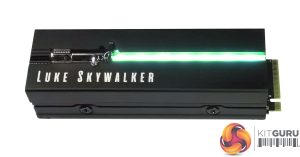 The heatsink is designed by the masters of the cooling art, EKWB (EK Water Blocks). It features an anodised-aluminium body and a textured micropore surface to help transfer the heat away from the drive. The swappable face plates are held in place by the clever use of a spring-loaded ball. The ball also allows the face place to move from side to side so it doesn't hinder either pushing the drive into the M.2 slot on the motherboard or fixing the holding screw in place. The top of the heatsink features a 10-light LED strip which can be controlled by most of the RGB software around.