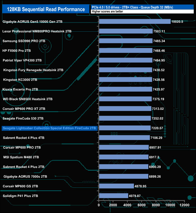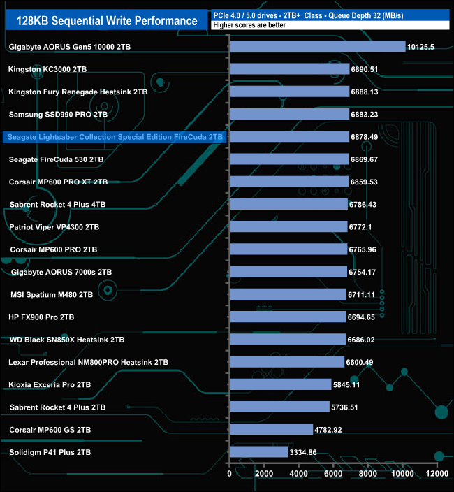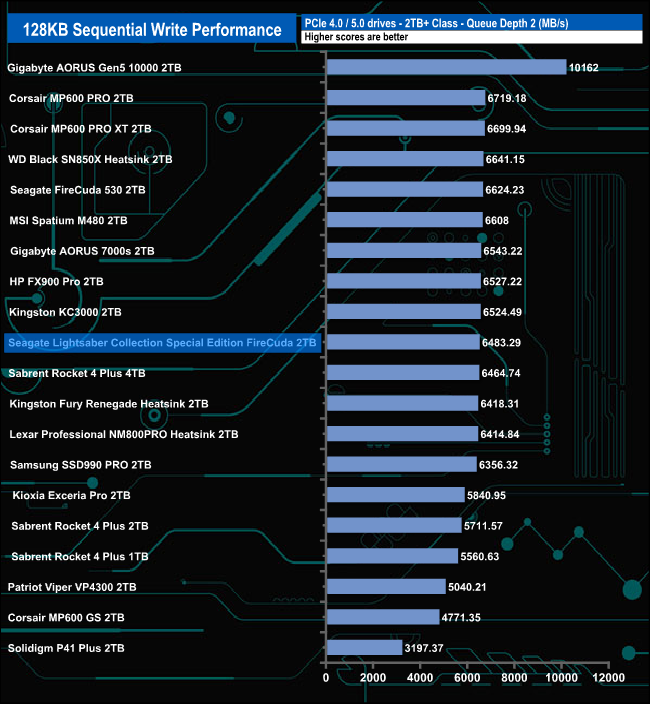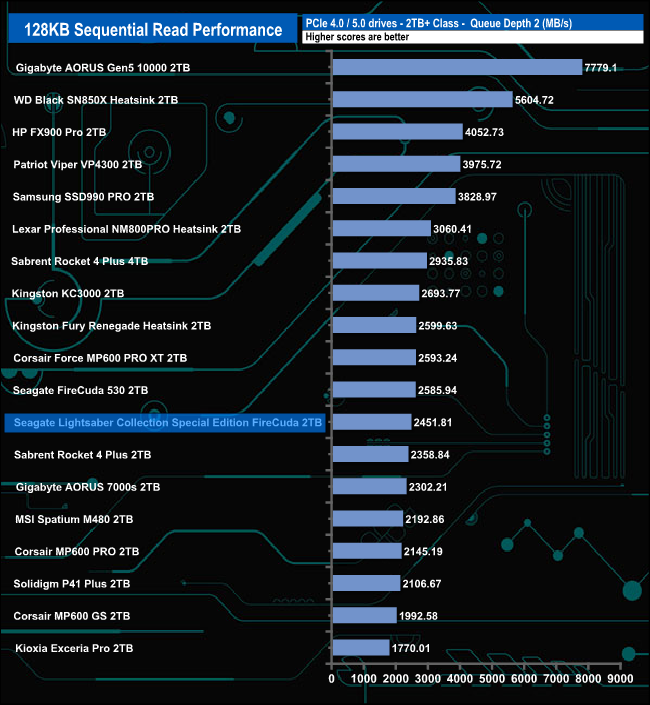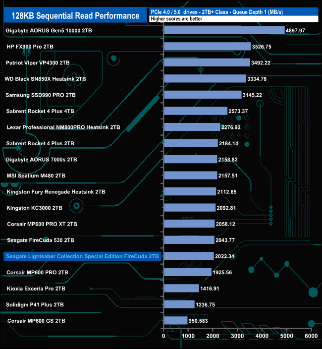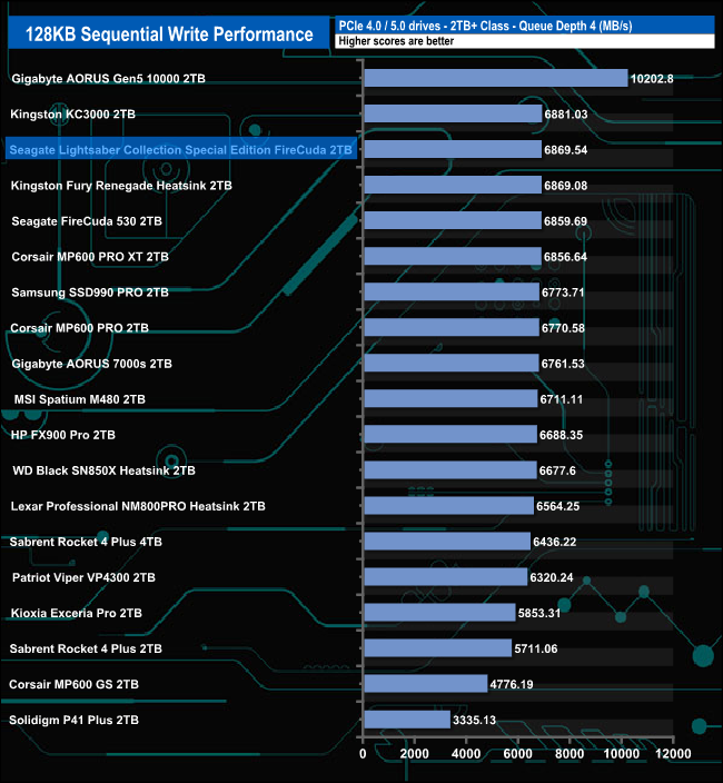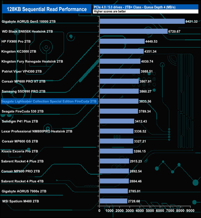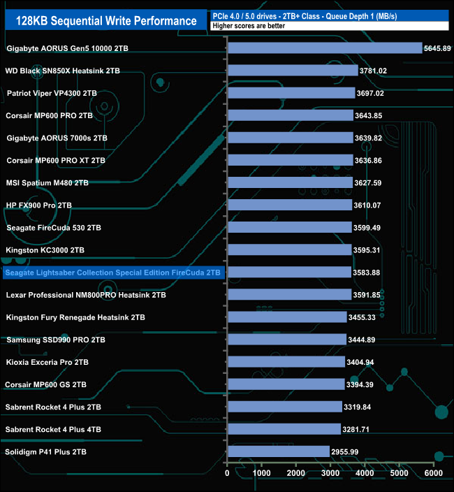 At queue depths 1 and 2, the Seagate Lightsaber Collection Special Edition FireCuda sits below the standard FireCuda 530 which is the basis for the Special Edition drive. However, as the queue depth deepens further the drives swap places with the Special Edition drive becoming the fastest.