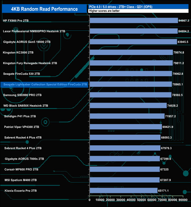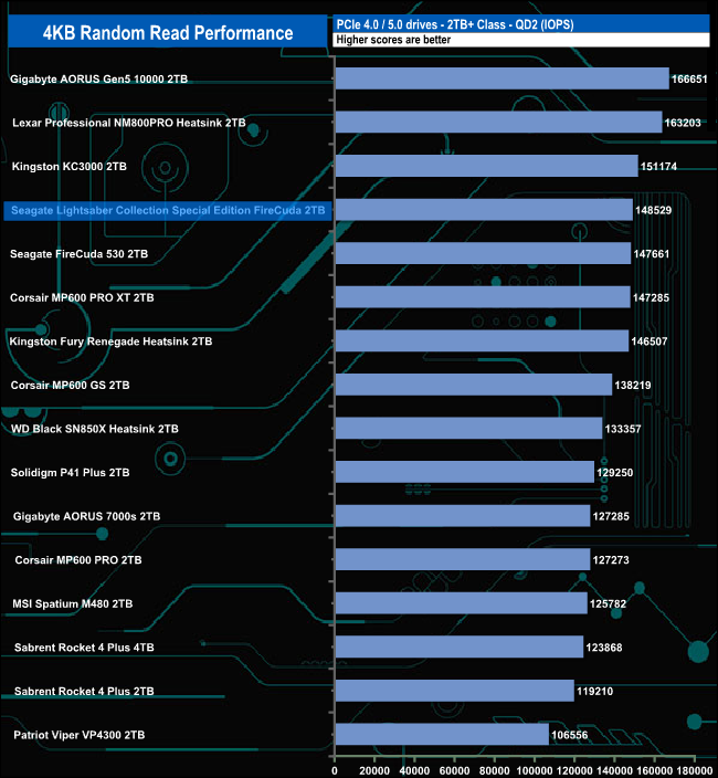 At QD1 the Seagate Lightsaber Collection Special Edition FireCuda sits behind the standard 2TB FireCuda 530, but as the queue depth deepens the drives swap places and remain that way throughout the testing procedure.