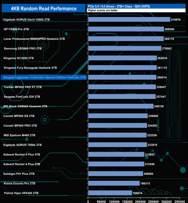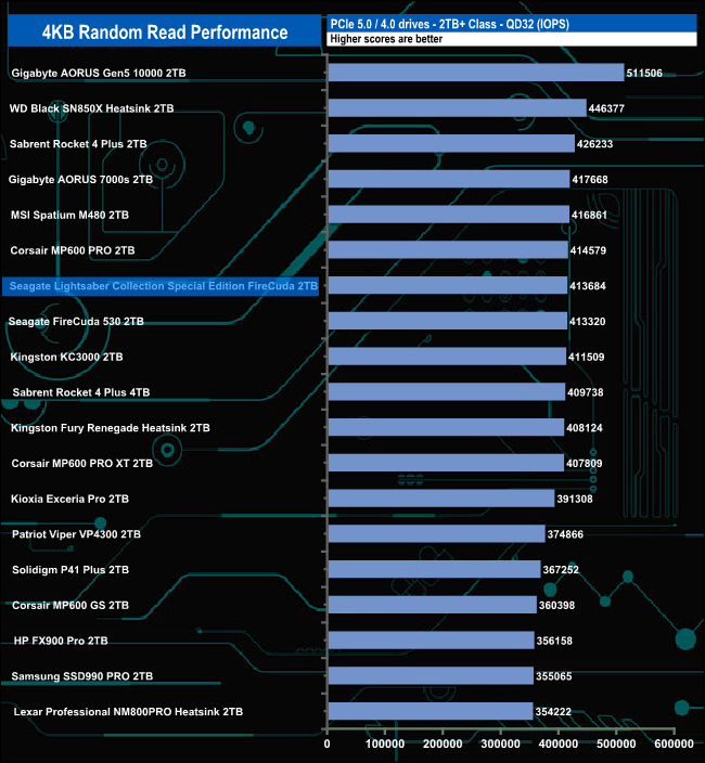 Seagate rates the 4K random read performance of the 2TB Lightsaber Collection Special Edition FireCuda as up to 1,000,000 IOPS. With our 4-threaded testing, we couldn't get close to this maximum figure. The best we saw was 413,723 IOPS at QD16, the performance does drop a little at the end of the test, with the drive producing a figure of 413,684 IOPS at QD32.