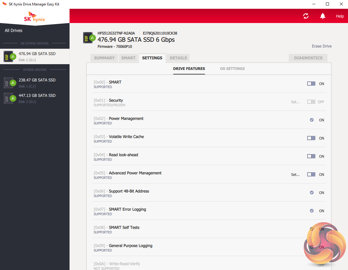 SK hynix’s SSD management software is called Drive Manager Easy Kit. With it you can monitor the life of the drive, its temperature, check the SMART details and diagnose any problems with the drive. It also allows the drive’s firmware to be updated and to be securely erased or sanitised.