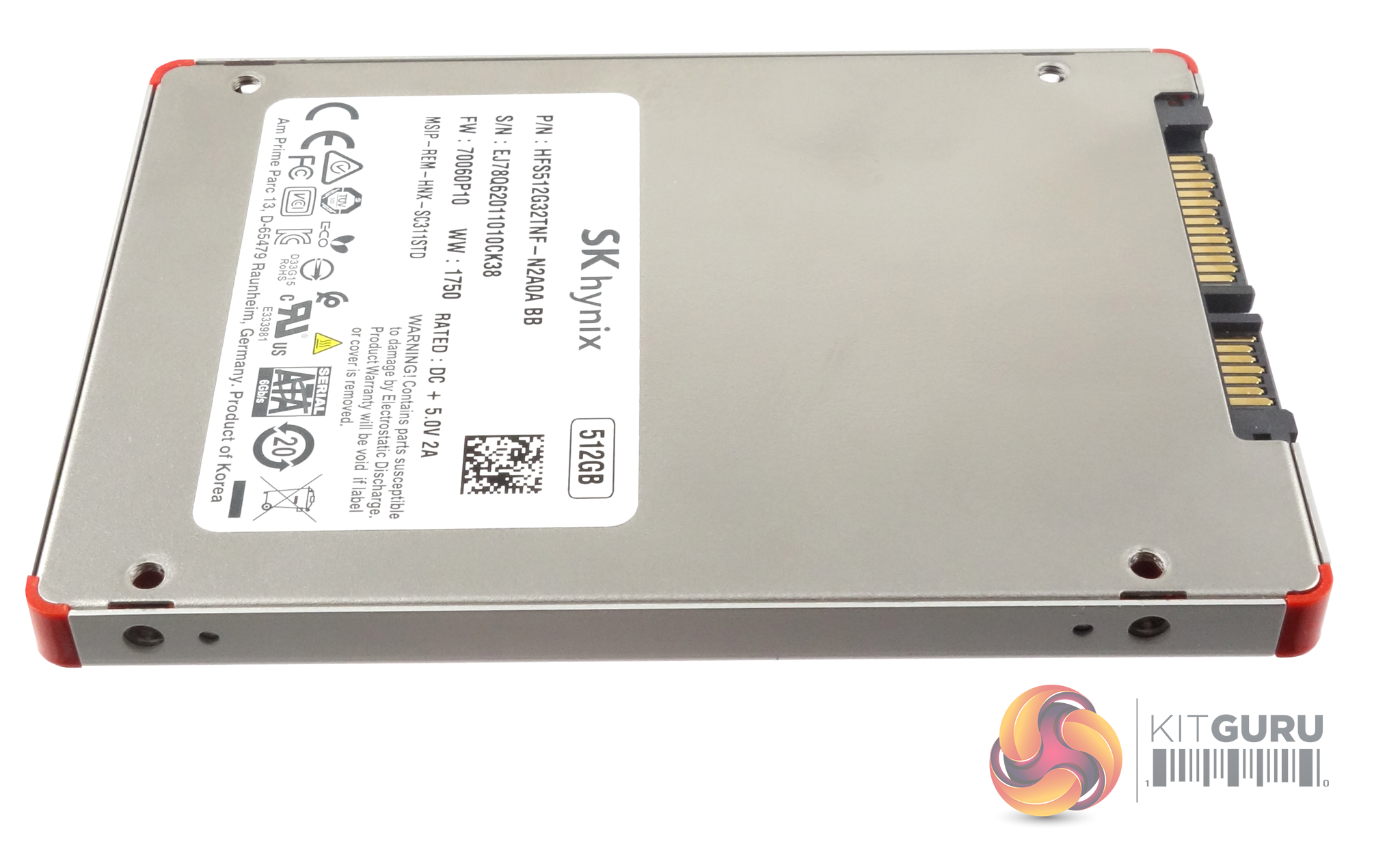 All the drives components are in-house SK hynix parts and are built on one side of the PCB. The 512GB drive uses four 1024Gb 3D TLC NAND packages (labelled H27Q1T8PPM8A). To the left of the NAND is the SK hynix SH87820BB 8-channel controller with the single LPDDR2 cache chip sitting above it.