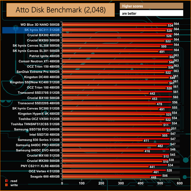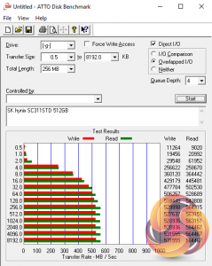 The official sequential read/write figures for the 512GB SK hynix SC311 are up to 540MB/s and 530MB/s respectivley. Using the ATTO benchmark the review drive bettered the official read score by some 26MB/s at 564MB/s reads. The tested write figure was slightly behind the official maximum figure at 528MB/s.