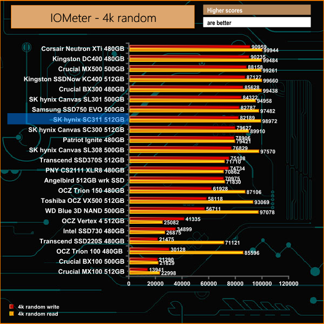When it comes to random 4K performance, the official figures for the 512GB SC311 are up to 100,000 IOPS for reads and 90,000 IOPS for writes. Using our 4K IOMeter tests we couldn't match that top figure for either but with reads of 98,972 IOPS and 82,189 IOPS for writes, the review drive was still well in the ball park for both.