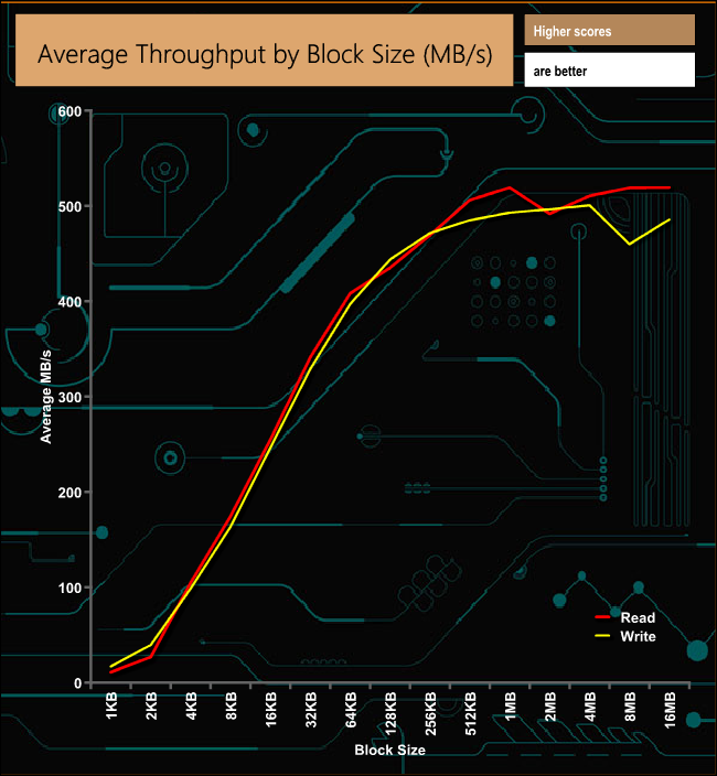 In our throughput test both reads and writes suffered a dip in performance towards the end of the test, but both recovered quickly. Peak performance for reads came right at the end of the test where it averaged 519MB/s while writes peaked at the 4MB block size at 500MB/s.