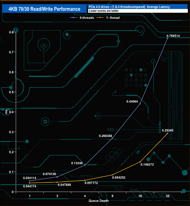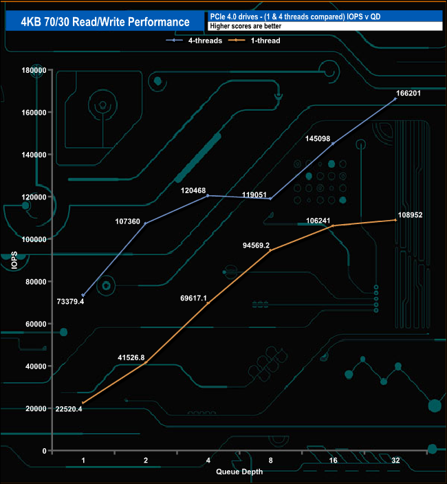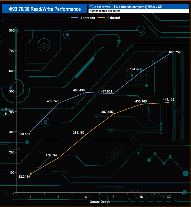 We used CrystalDiskMark 8’s custom settings to test the 4K 70/30 mixed read/write performance of the drive through a range of queue depths using a single thread and four threads.
