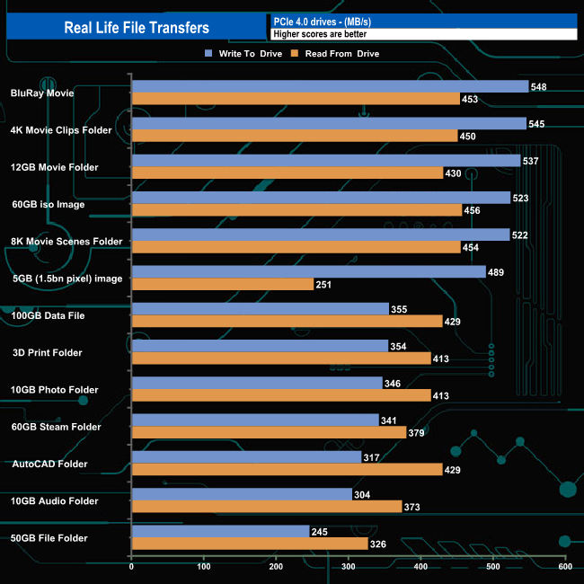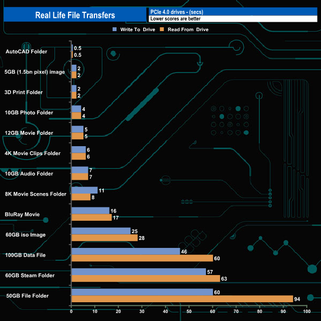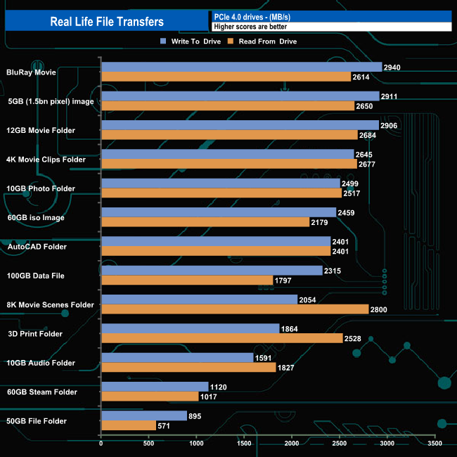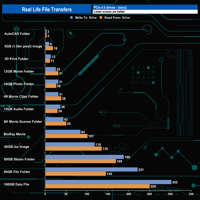 Writing to and reading from an NVMe drive saw transfer speeds rocket and overall transfer times dropped dramatically as you might expect. Nine of the transfers topped over 2GB/s when writing to the drive with three, the BluRay movie, 5GB image and the 12GB Movie folder going over 2.9GB/s. Of the remaining four tests, three topped 1GB/s with the slowest being the 50GB file folder. The fastest read speed was 2.800MB/s when dealing with the 8K Movie scenes folder.