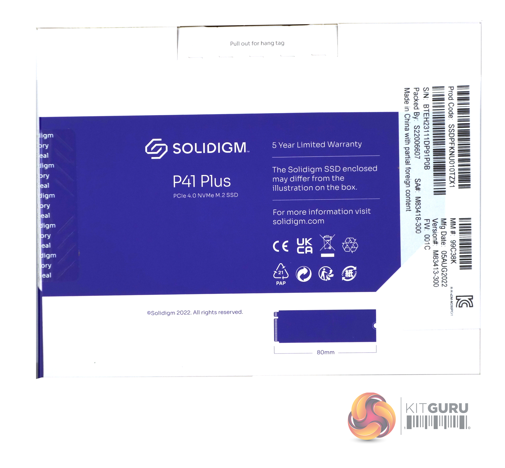 The Solidigm P41 Plus comes in a small but sturdy box with a close-up image of the drive on the front. To the left of the image is a sticker carrying the drive's size and its Sequential read speed rating (4,100MB/s). Under the product name is a line stating that the drive uses a PCIe 4.0 interface. This is repeated on the back of the box, along with a statement that the drive has a 5-year warranty. Towards the bottom edge of the box, there is a diagram showing the drive's length.