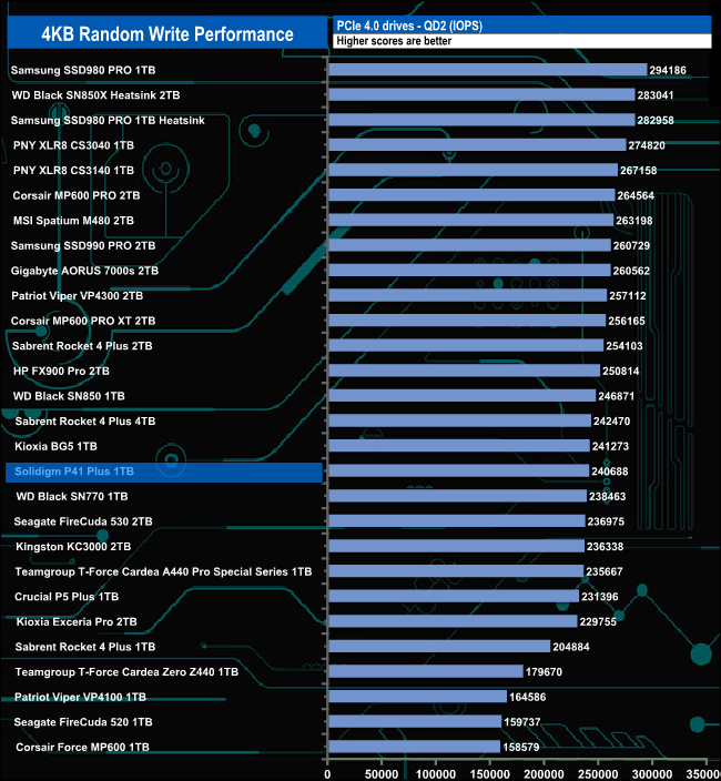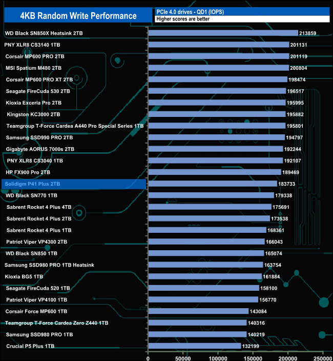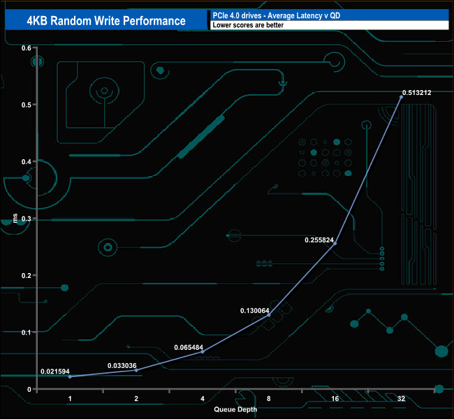 We used CrystalDiskMark 8‘s custom settings to test the 4K random write performance of the drive through a range of queue depths. The setup for the tests is listed below.
