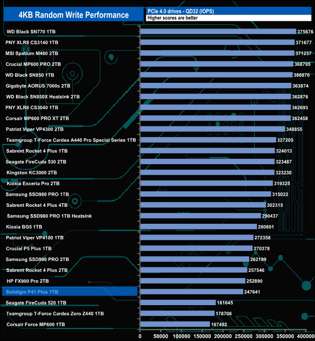 The best random write figure we saw in our 4-threaded random write test was 247,641 IOPS (1014.34MB/s) at QD32 which is way off the official maximum figure of 520,000 IOPS. We did a quick test at QD32 using 8 threads and got a result of 420,582 IOPS, still short of the official maximum.