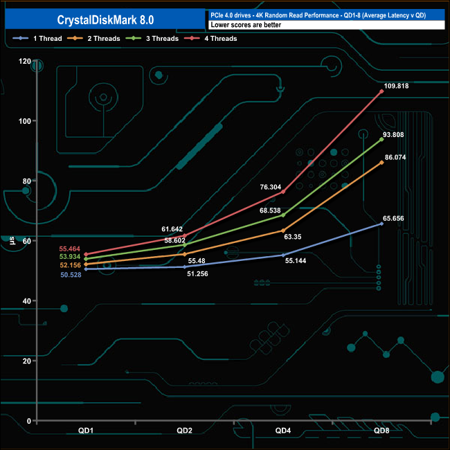We used CrystalDiskMark 8 to test the random performance of the drive at lower queue depths (QD1 – QD8 where most of the everyday workloads occur) using 1 to 4 threads.