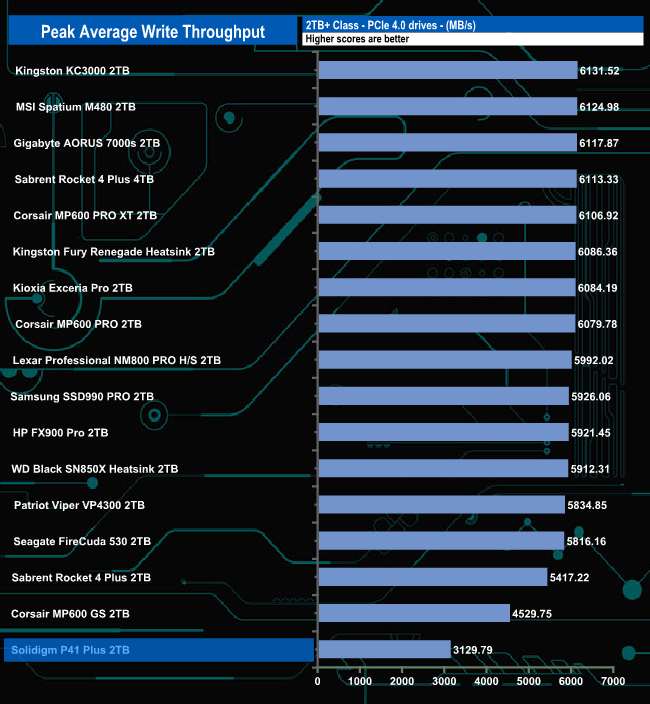 As with the peak read throughput result, the peak write test result of 3,192MB/s sees the drive in last place in the results chart.