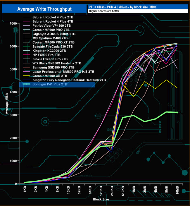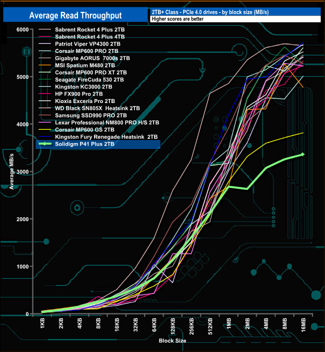 In our read-throughput tests, the 2TB P41 Plus peaked at the 16MB block mark at 3,358MB/s, a good deal short of the maximum official figure of 4,125MB/s.