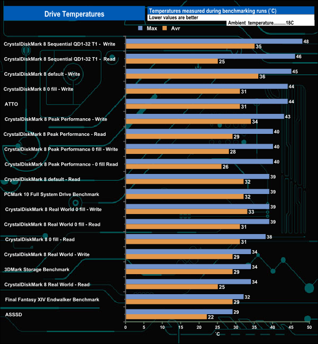 We took note of the drive’s temperature during some of our benchmarking runs. The 2TB Solidigm P41 Plus doesn't come with any form of a physical heat sink and Solidigm claim it has been optimised for thermal efficiency and reduced throttling which seems to be confirmed by our test results. The hottest the drive got was when being pushed extremely hard during repeated runs of the CrystalDiskMark 8 Sequential write tests where the drive got to 48° C, 22° C below the stated maximum of 70° C but there didn't appear to be any throttling issues. For the bulk of our testing, the temperature averaged around 35° C, well below that 70° C maximum operating temperature.