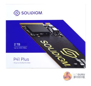 The Solidigm P41 Plus comes in a small but sturdy box with a close-up image of the drive on the front. To the left of the image is a sticker carrying the drive's size and its Sequential read speed rating (up to 4,100MB/s). On both the front and back of the box is a description of the format and architecture of the drive. Also on the back of the box is a statement that the drive has a 5-year warranty. Towards the bottom edge of the box, there is a small diagram showing the drive's length.