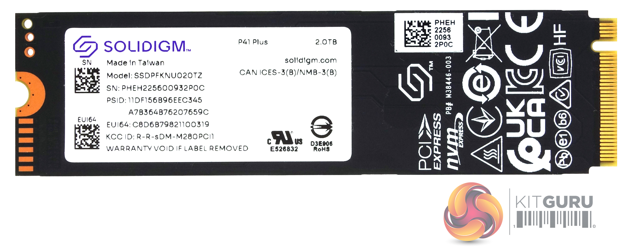 Under the product label on the front of the drive sits a 4-channel Silicon Motion SM2269XT controller which looks after a pair of 1TB packages of Solidigm 144-layer 3D QLC NAND. As the P41 Plus is a DRAM-less drive these are the only major components on the PCB. The SM2269XT is a compact (7.7 x 11mm package) DRAM-less design built on a 12nm process using a dual-core ARM R8 processor with 4 NAND channels running at 1,600 MT/s per channel. It supports 3D TLC and QLC NAND. The controller supports AES128/256 encryption and is TCG OPAL 2.0 compliant and uses the 7th generation of Silicon Motion's NANDXtend ECC technology.