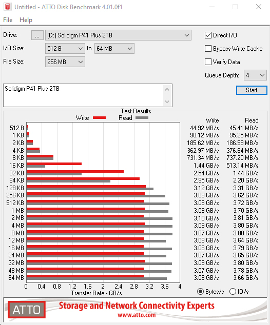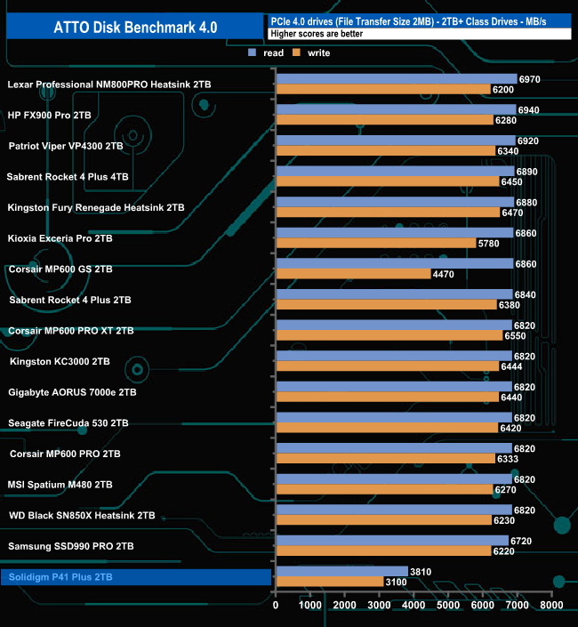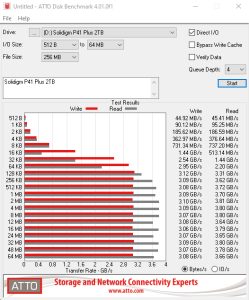 Officially the 2TB P41 Plus is rated as up to 4,125MB/s and 3,325MB/s for Sequential reads and writes respectively. Using the ATTO benchmark, we couldn't match the official figures for either, with a read result of 3,810MB/s and writes at 3,100MB/s.