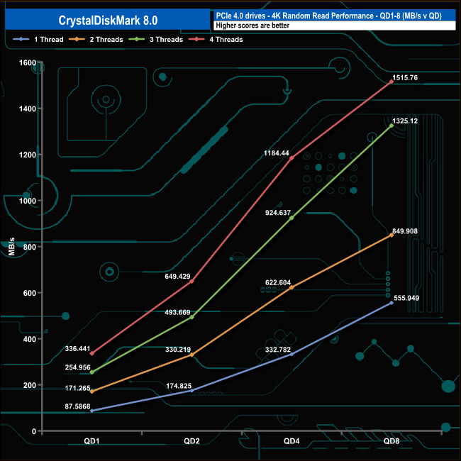 We used CrystalDiskMark 8 to test the random performance of the drive at lower queue depths (QD1 – QD8 where most of the everyday workloads occur) using 1 to 4 threads.