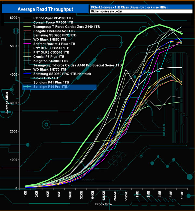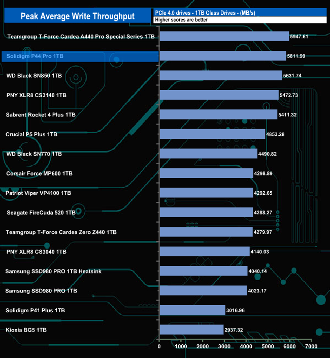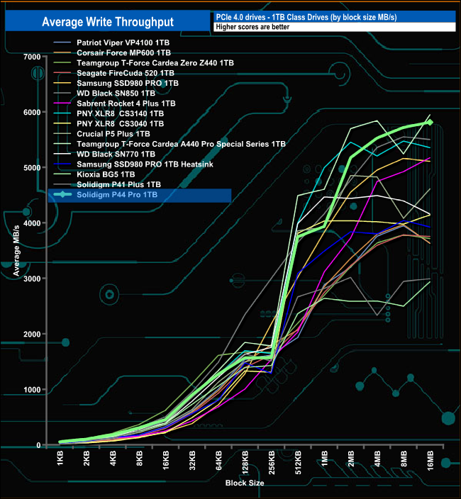 When it comes to write throughput test, the P44 Pro peaked at 5,811MB/s (16MB block) which is short of the official write figure of 6,5000MB/s, but still good enough for second place in our results chart.