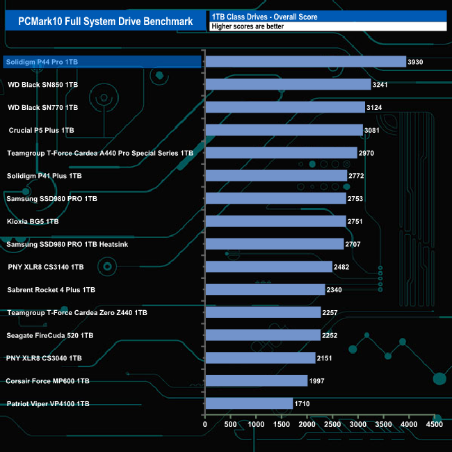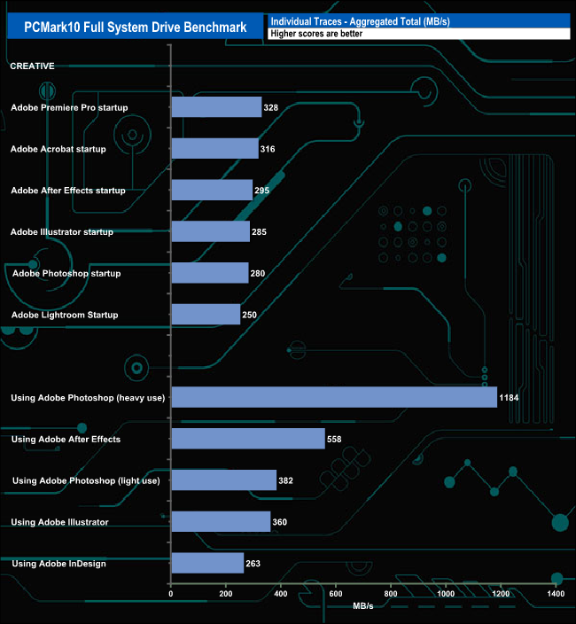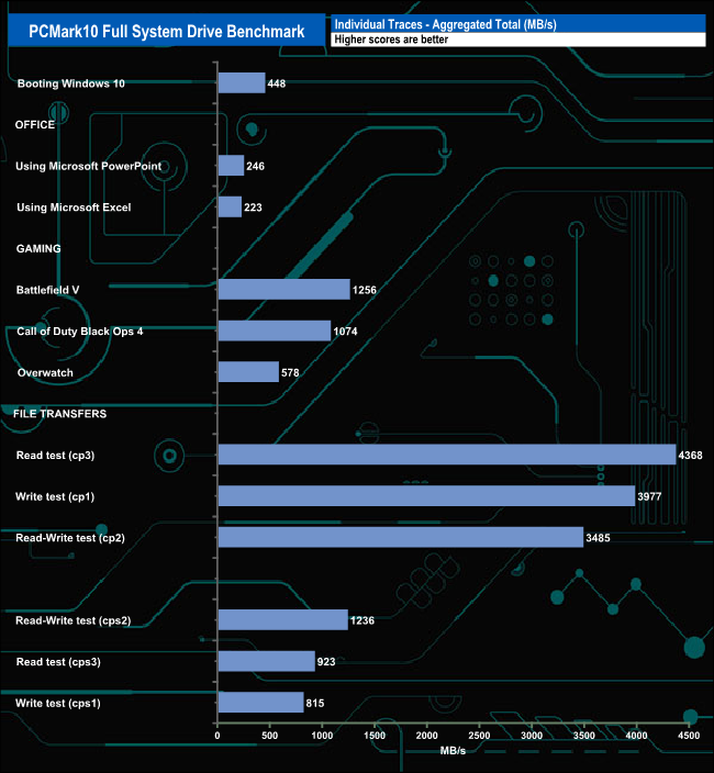 The PCMark 10 Full System Drive Benchmark uses a wide-ranging set of real-world traces from popular applications and common tasks to fully test the performance of the fastest modern drives. The benchmark is designed to measure the performance of fast system drives using the SATA bus at the low end and devices connected via PCI Express at the high end.
