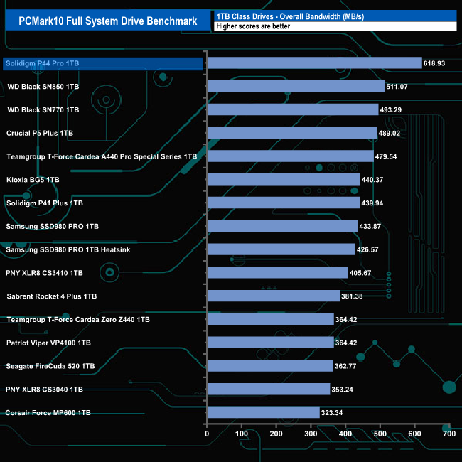 The 1TB P44 Pro sailed through PCMark 10's Full System Drive Benchmark without any problems. It averaged 292MB/s for the six Adobe start-up test traces, with the Premier Pro setup trace fastest at 328MB/s. The average for the five usage traces was 549MB/s, helped in no small part by the 1,184MB/s result for the Adobe Photoshop heavy usage trace.