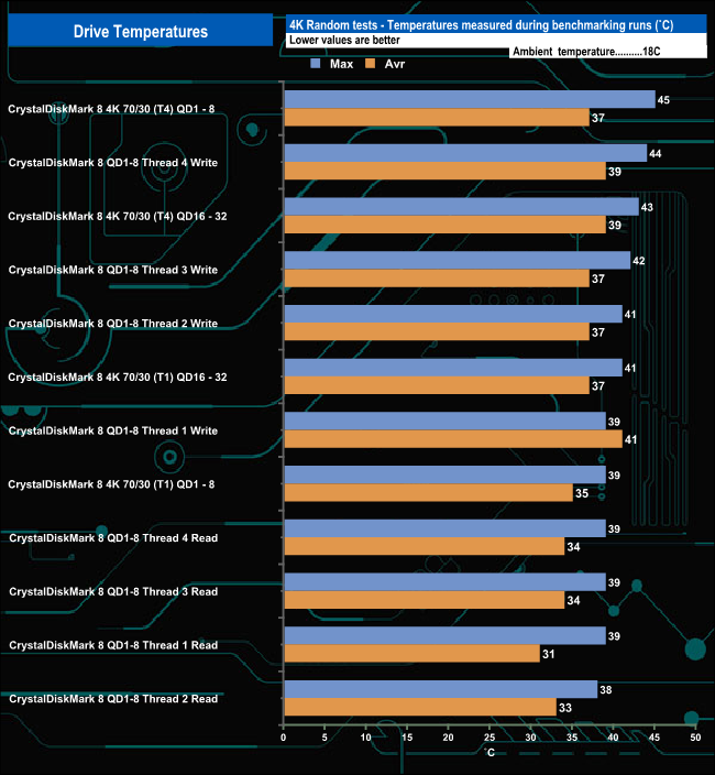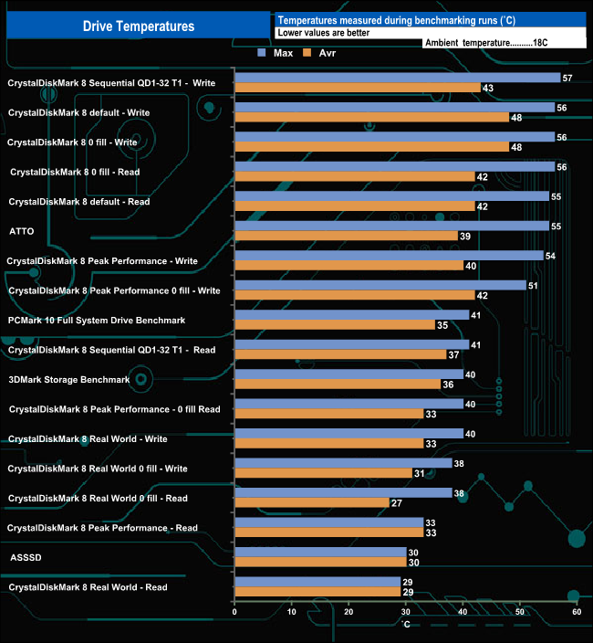 The hottest the drive got was when being pushed extremely hard during repeated runs of the CrystalDiskMark 8 Sequential write tests where it reached 57° C, 13° C below the stated maximum of 70° C which is a bit close for comfort, but there didn't appear to be any throttling issues.