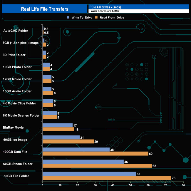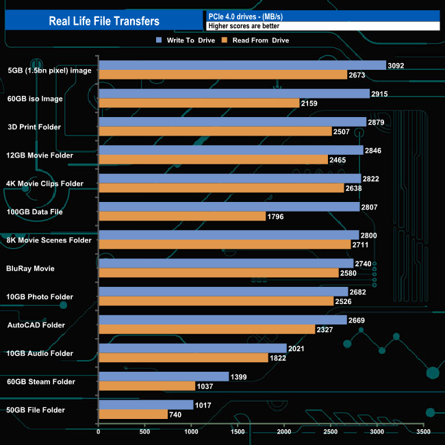 Switching to an all-NVMe environment, transfer speeds increased dramatically and access times plummeted. Ten of the write transfers topped 2GB/s, the fastest being the 3,092MB/s for the 5GB/s image transfer. Nine of the read transfers topped 2GB/s, again the fastest being for 5GB/s image transfer at 2,673MB/s,