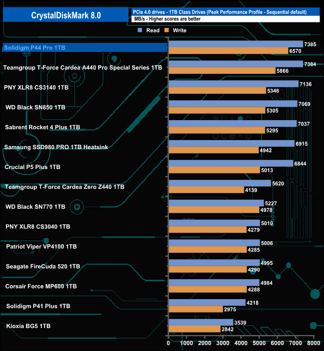 Switching over to the Performance Profile we could once again confirm the official Sequential read/write figures with test results of 7,385MB/s for reads and 6,570MB/s for writes which are good enough to put the drive at the head of our results chart.