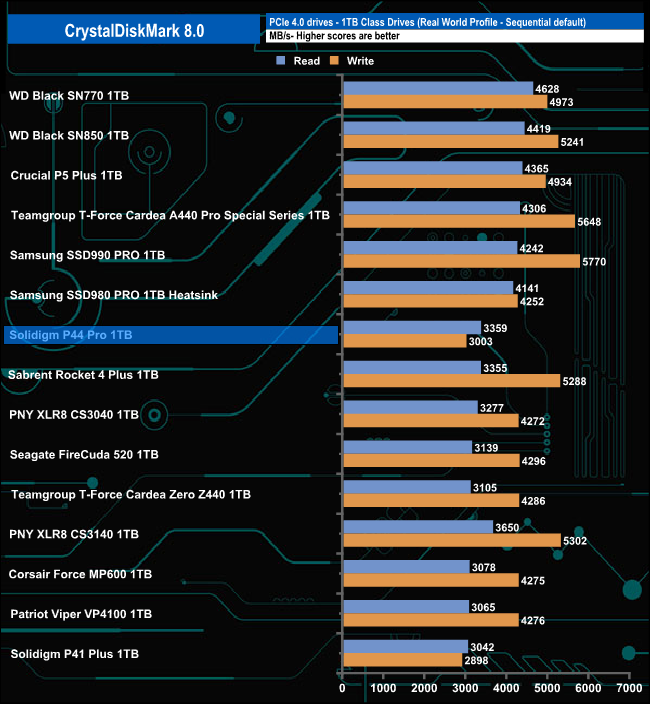 The drive doesn't perform quite so well in the Real World profile. Test results of 3,359MB/s and for reads 3.0003MB/s and writes respectively were only good enough to see the drive in a mid-table position.