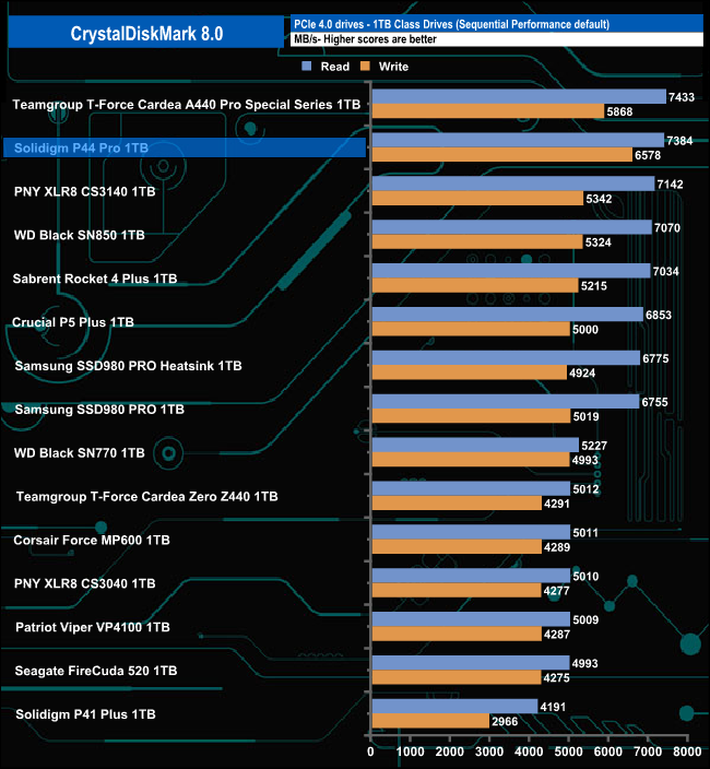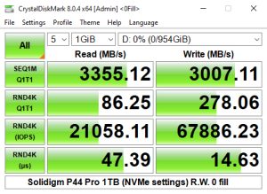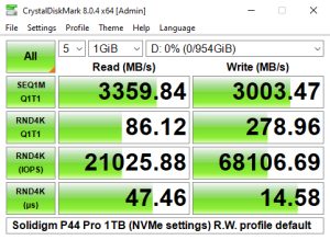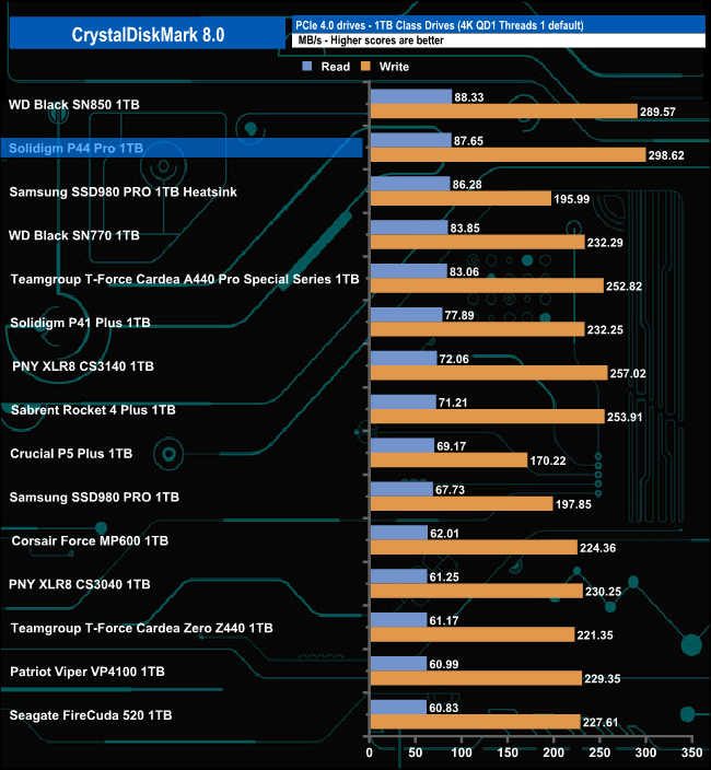 The P44 Pro performs well in CrystalDiskMark's 4K QD1 (single thread) test. With a read score of 87.65MB/s, it sits just behind WD's Black SN850 at the top of the results chart, but with a better write result than the WD drive.