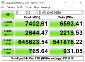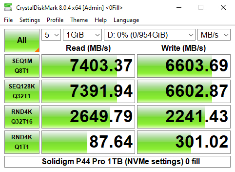 Looking at the benchmark result screens we can confirm the official Sequential figures for the drive of 7,000MB/s and 6,500MB/s for reads and writes respectively with a best-read result of 7,403MB/s (0 fill) while the fastest write speed we saw was 6,603MB/s (0 fill).