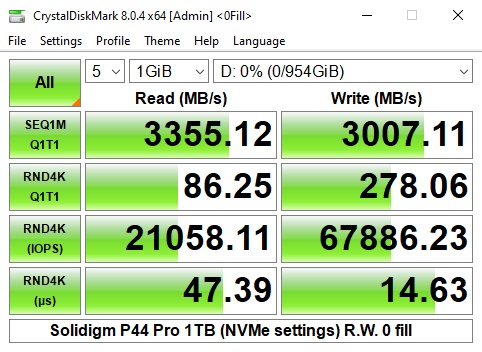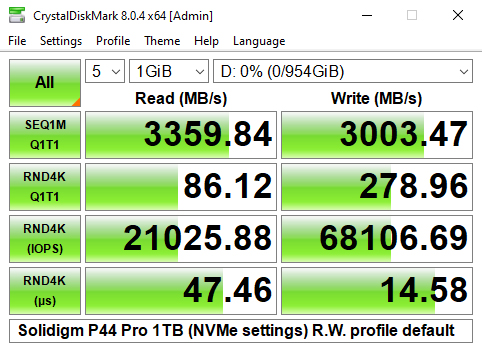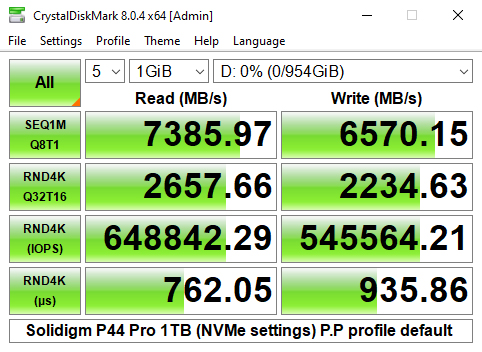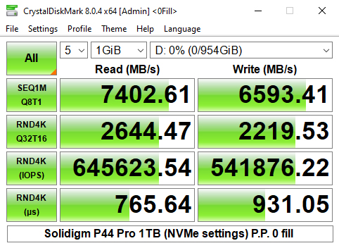 The Performance Profile result screen also includes a 4K IOPS score. The Solidigm P44 Pro produced test results of 648,842.29 IOPS for reads and 545,564.21 IOPS, way off of the official 1,400,000 IOPS / 1,300,000 IOPS (reads/writes) but still good enough to put the drive into third place in our results chart.