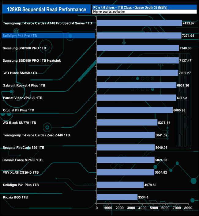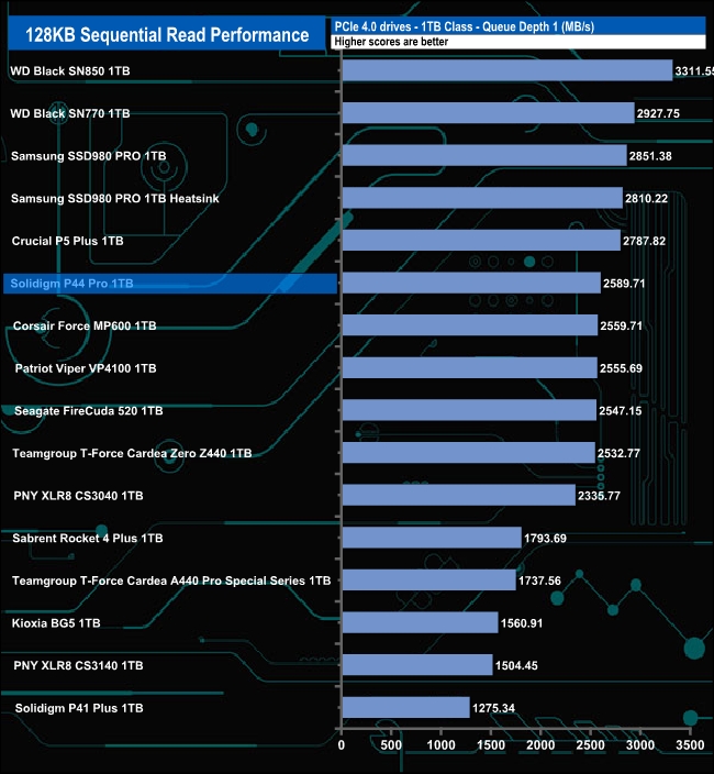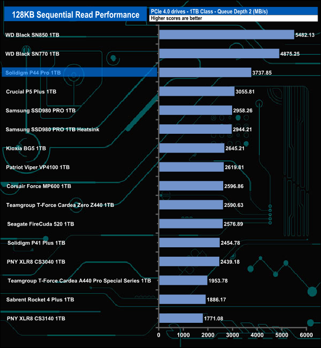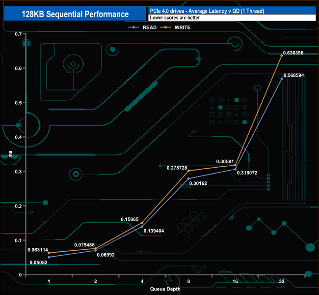 The drive's best performance in relation to the drives around it comes at QD2 (where it sits third in the results chart) and QD32 (second spot in the chart). At QDs 1 and 4 it still performs well, good enough to retain a top 10 spot at these two queue depths.