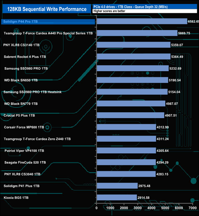When it comes to our Sequential write tests, the drive's performance at lower queue depths is nothing to write home about but at QD32 the drive seems to come alive, its test result of 6,582.69MB/s not only confirms the official maximum of 6,5000MB/s, it is also the fastest Sequential write performance for a 1TB class consumer drive we've seen to date.