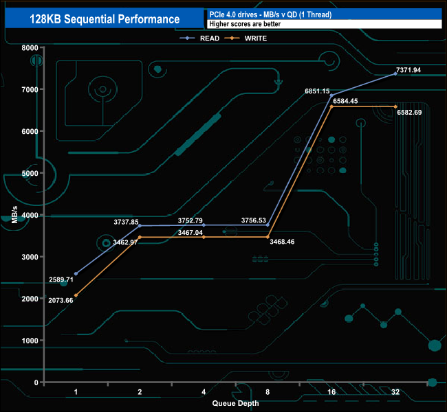 We used CrystalDiskMark 8‘s custom settings to test the Sequential read and write performance of the drive through a range of queue depths. The setup for the tests is listed below.