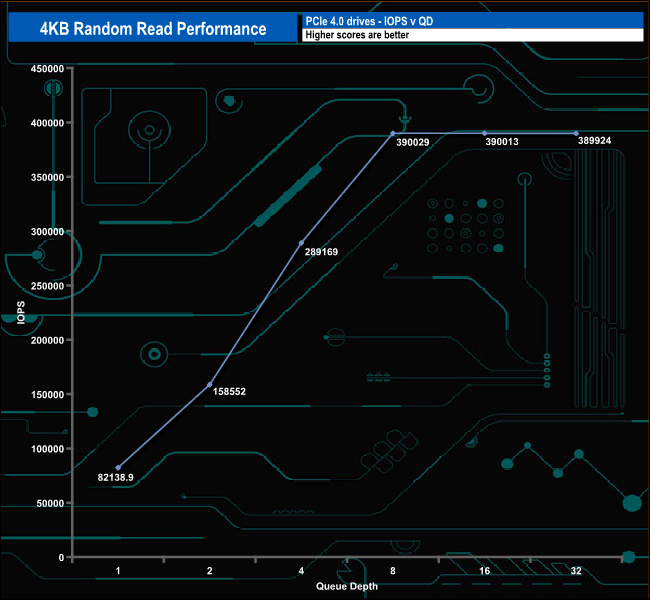 Officially the Solidigm is rated as up 1,400,000 IOPS for 4K random reads. With our four-threaded testing, we couldn't get close to this figure, the best we saw was 390,029 IOPS at a QD of 8.