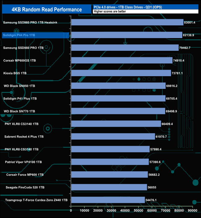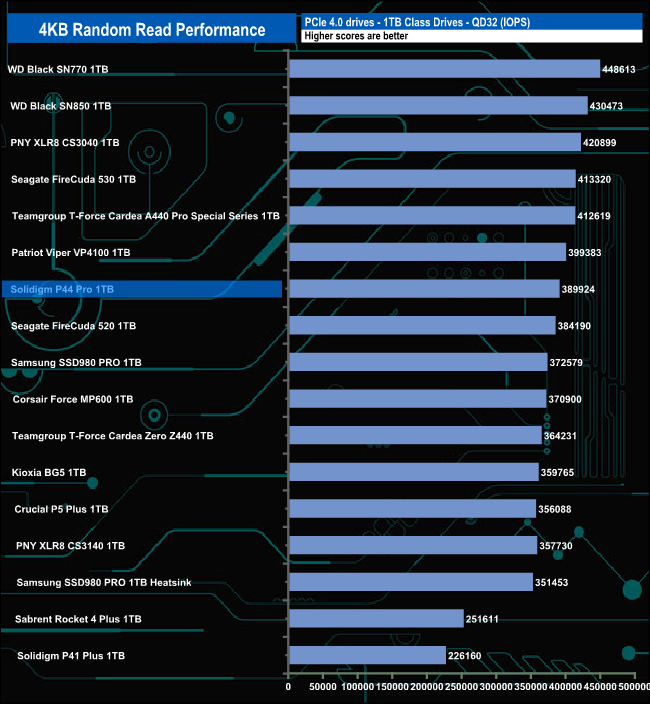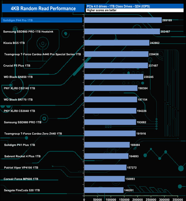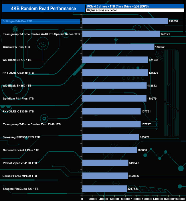At QDs 2 and 4, the P44 Pro is the fastest 1TB class drive we've seen to date with test results of 158,552 IOPS and 289,169 IOPS respectively. To give an idea of how much faster the P44 Pro is over the P41 Plus, the latter produced a figure of 118,813 IOPS at QD2 and 169,494 IOPS at OD4.